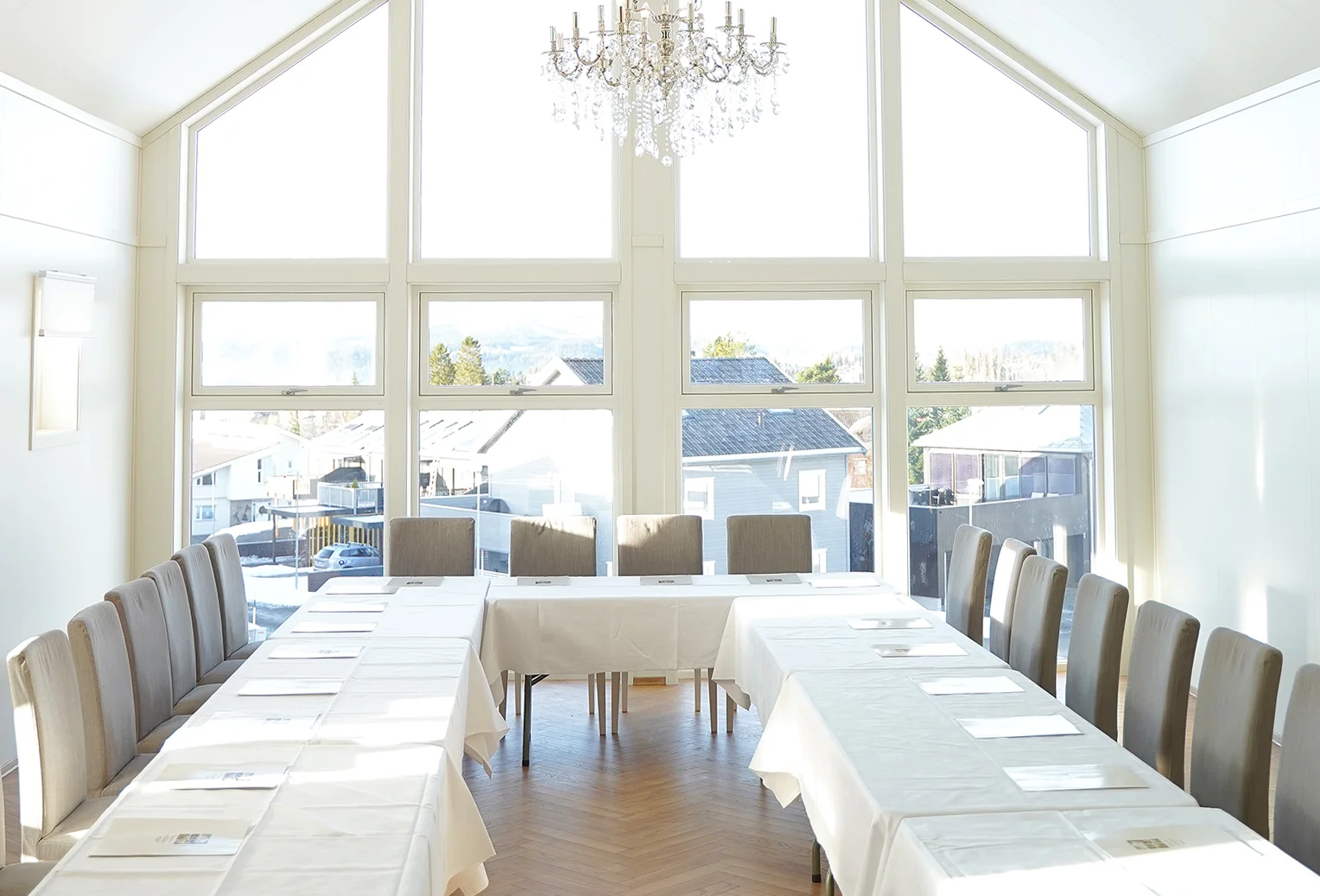 På "Utsikten" er det er det høyt under taket, luftig og som navnet sier, - en fantastisk utsikt. Lokalet er utmerket for møter med pluss/minus 50 deltagere - avhengig av hvilket oppsett som ønskes.