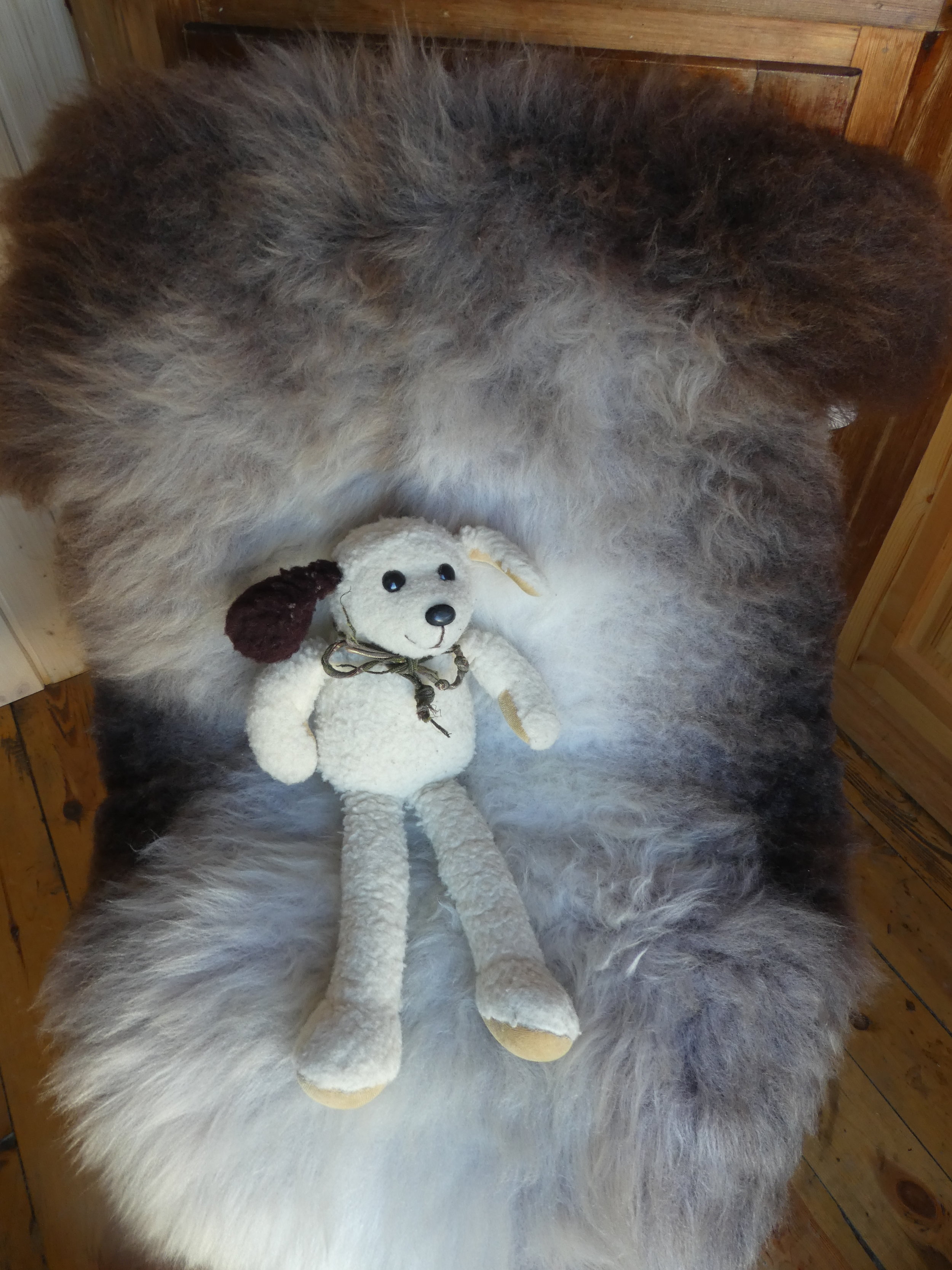 Vi har og sauer av rasen Grå Trøndersau. Det gjev fine skinn som du og kan få kjøpt hos oss.